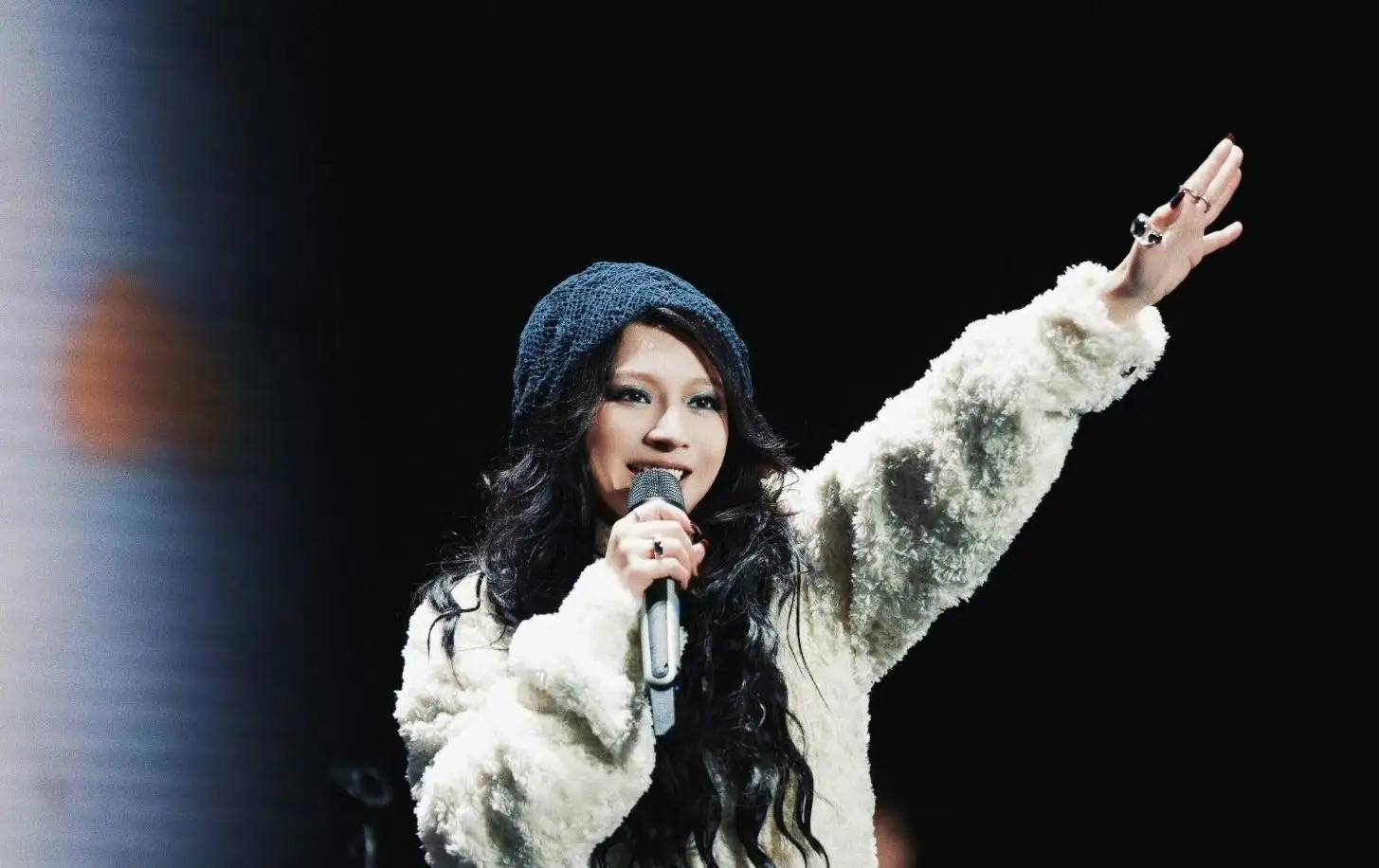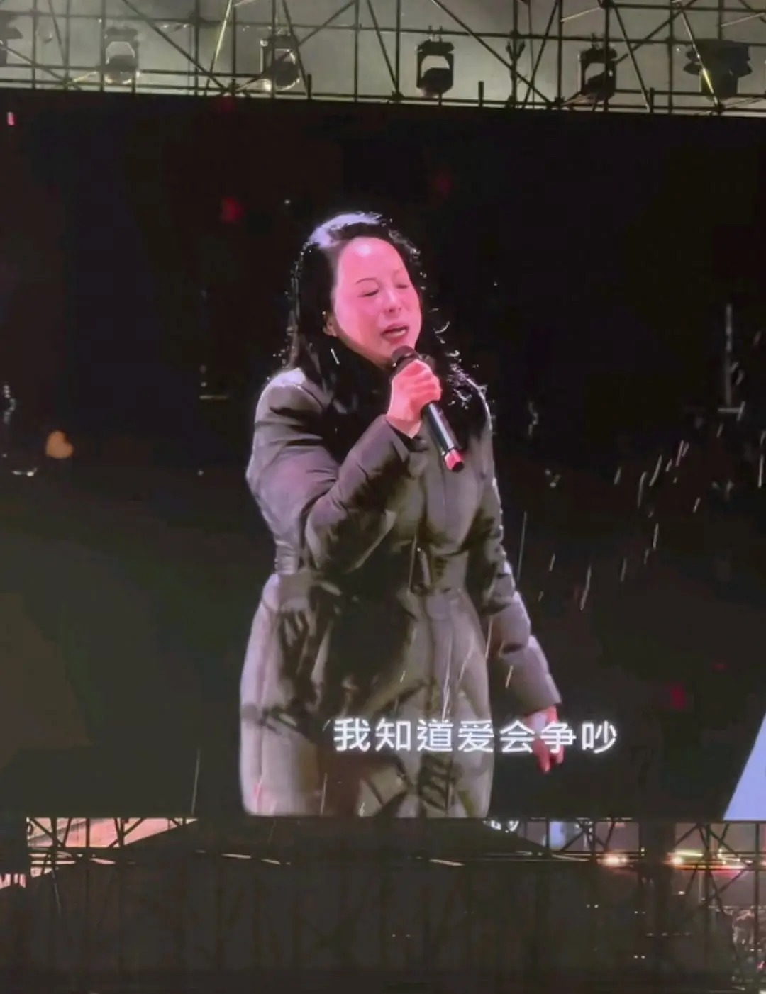 站定后,她作念的第一件事,是向台下密密匝匝的三万不雅众深深鞠躬。随后,音乐响起,她的歌声穿透密集的雨幕。雨水很快打湿了她的头发,湿淋淋地贴在面颊,安稳的羽绒服下摆接续往下淌水,捏着麦克风的手浮现冻得发红。为了取暖,她在演唱缝隙不休地蹦跳、顿脚,甚而用纸巾擦抹脸上混杂的雨水和因凉爽不自发流出的眼泪。
