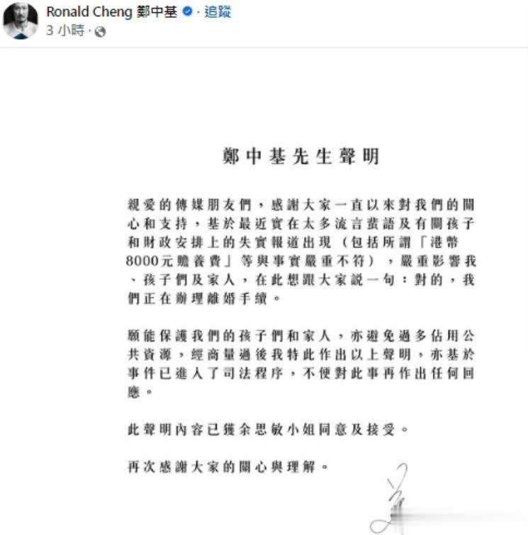 郑中基仳离声明中的 “清楚”:抚育费的真相