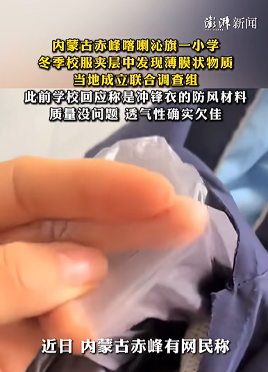 网民发布视频反应的慑服系我旗锦山第三小学2025年5月份采购、7月份到货、9月份开动使用的。2026年1月9日上昼,学生家长李某在为孩子缝合慑服裤子裆部开线处时,发现面料中存在薄膜状物资,因对材质存疑,拍摄视频发布到个东谈主外交媒体账号,该视频随后在收集上被转载传播。